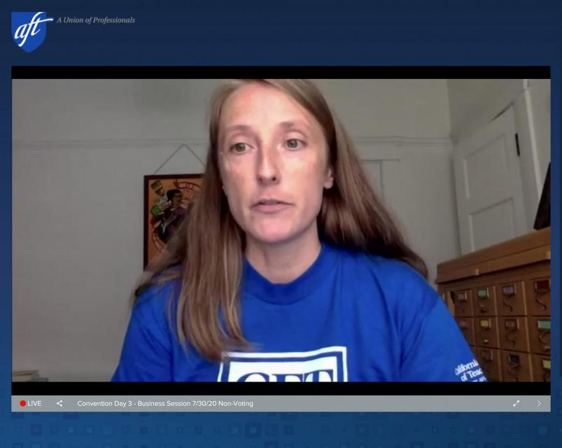 The “Encourage Contingent Faculty Participation in Shared Governance” resolution, calls for AFT to “support legislation for contingent faculty to be included and enfranchised without regard to their part-time status and compensated in shared governance work.” The resolution, which passed on the Virtual Convention floor with a 98 percent vote, was part of a two-year joint effort between the CFT Part-Time Faculty Committee and University Council-AFT, representing contingent lecturers at the University of California.