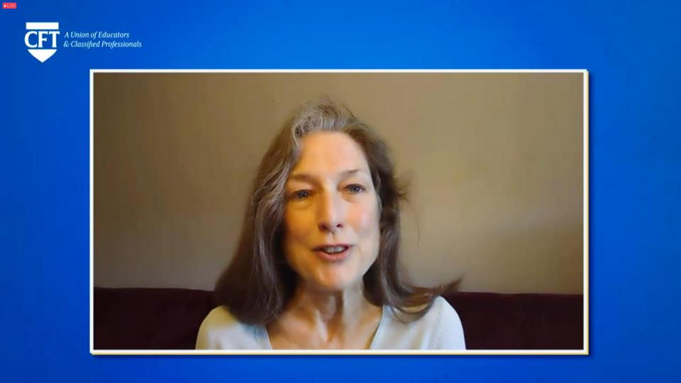 Kent Wong, director of the UCLA Labor Center and a CFT vice president, introduced Linda Delp who just retired as director of UCLA’s Labor Occupational Safety and Health Program, after being on staff for more than 30 years. Wong called her a national leader for worker justice and talked about the struggle of Amazon workers in Alabama to unionize and of grocery workers to get hero pay during the pandemic.