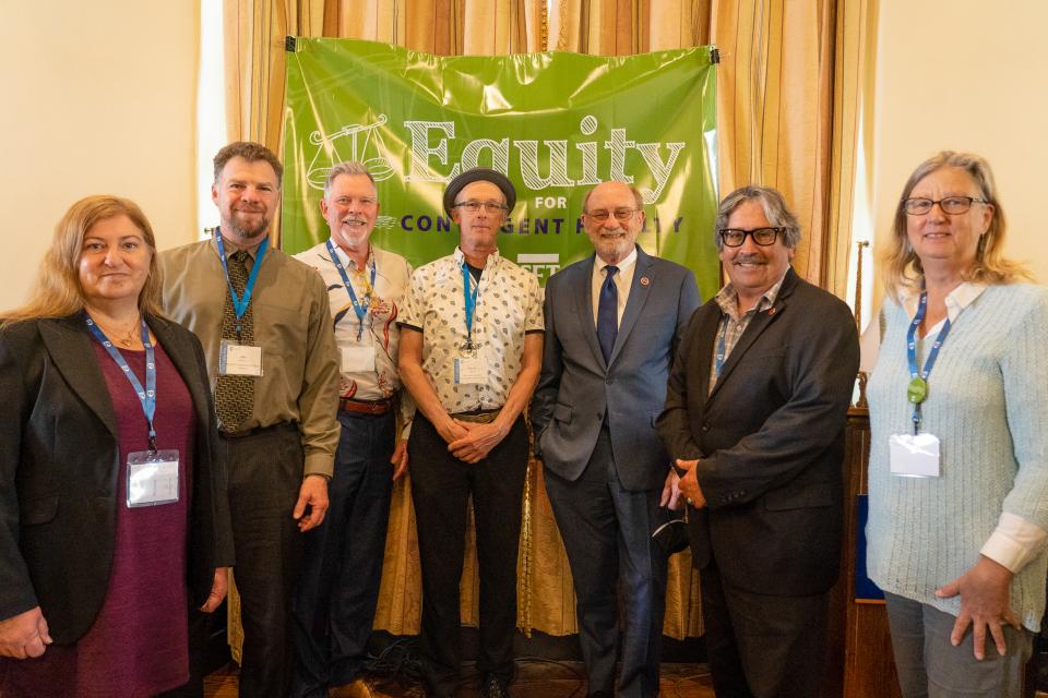 From the Bay Area to San Diego, and from the Central Valley to the Mojave Desert, part-time community college faculty, along with full-time faculty and student allies, gathered at Sacramento’s famed Sutter Club on Monday morning, May 1, to go forth and make California legislators aware of the critical need for part-time faculty healthcare and pay parity.