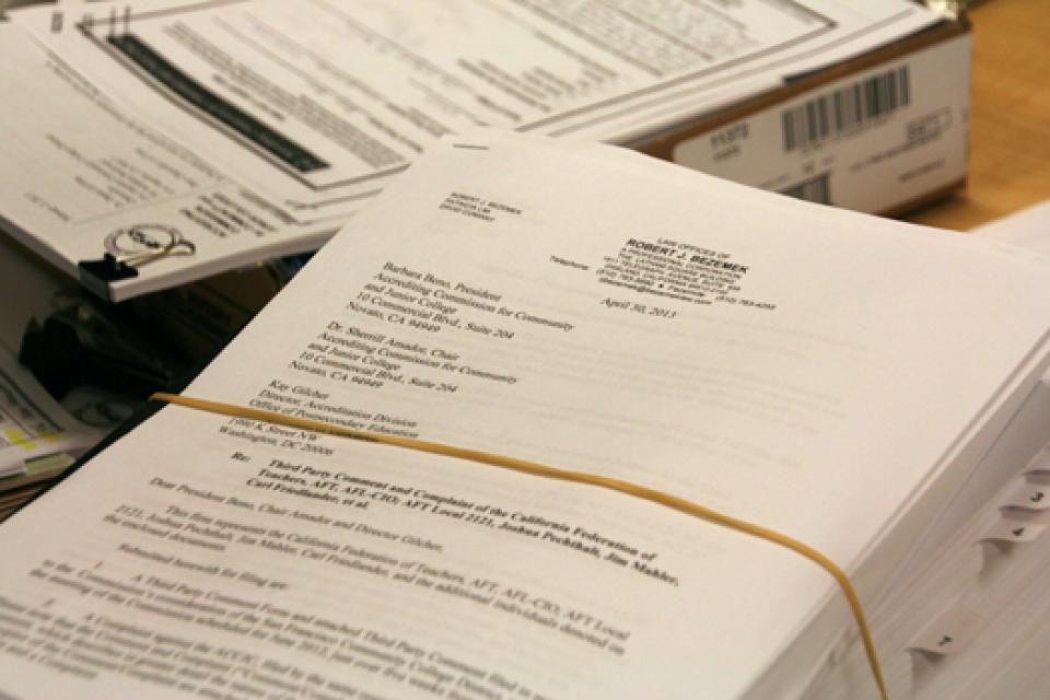April 30, 2013, Novato—Today the CFT and its City College of San Francisco affiliate, AFT Local 2121, filed a complaint or “third party comment” with the Accrediting Commission for Community and Junior Colleges (ACCJC), and sent a copy to the United States Department of Education (USDOE).